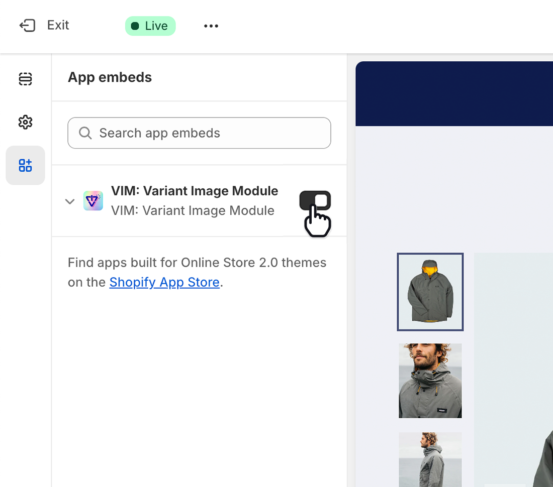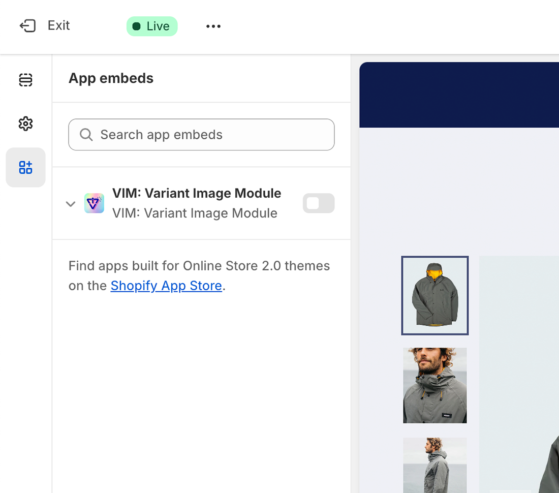 Extend the App to a theme of choice by turning on the VIM: Variant Image Module app embed from the theme's editor.