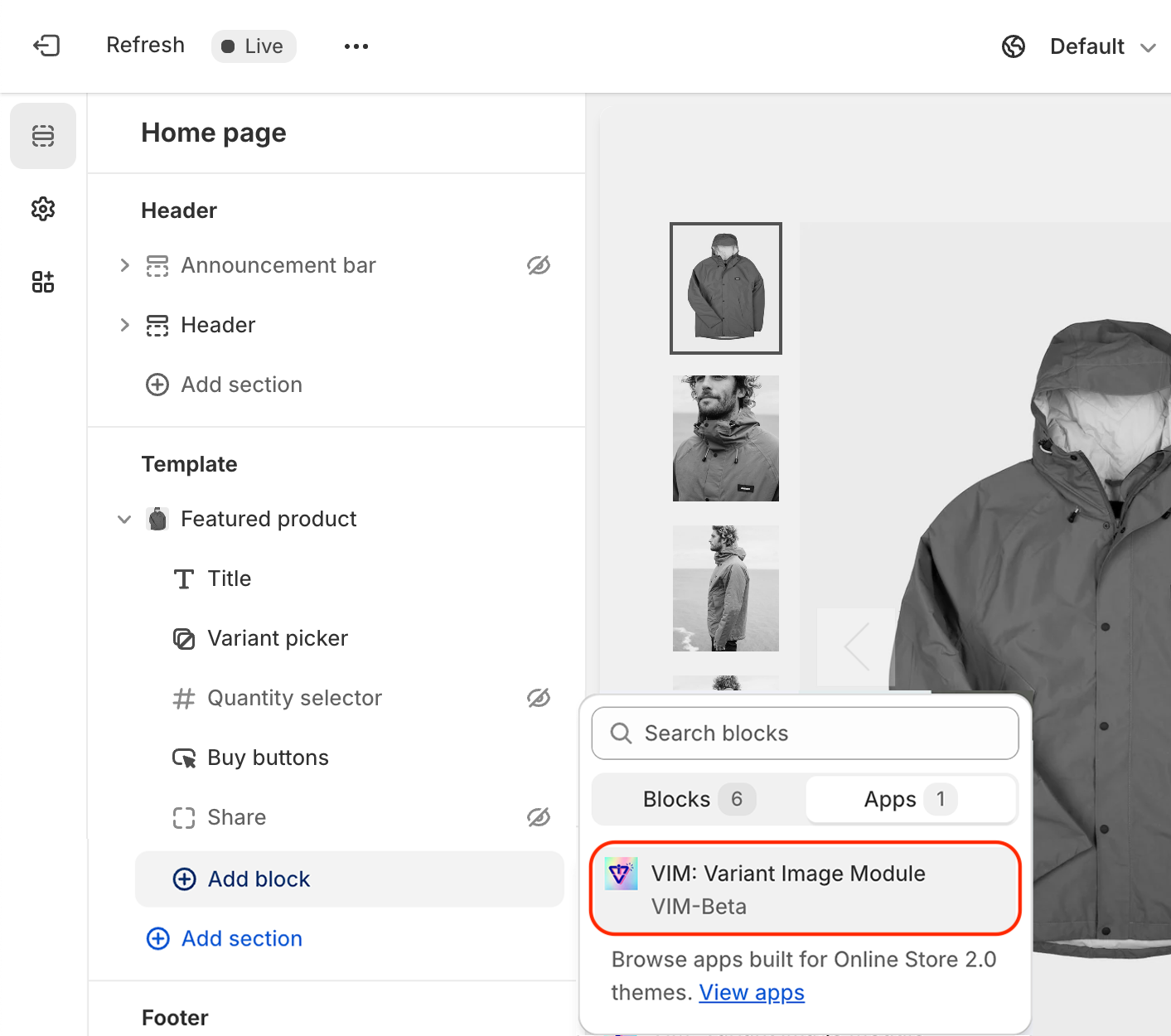 Extend the App to a theme of choice by adding the VIM: Variant Image Module app block to the product section.